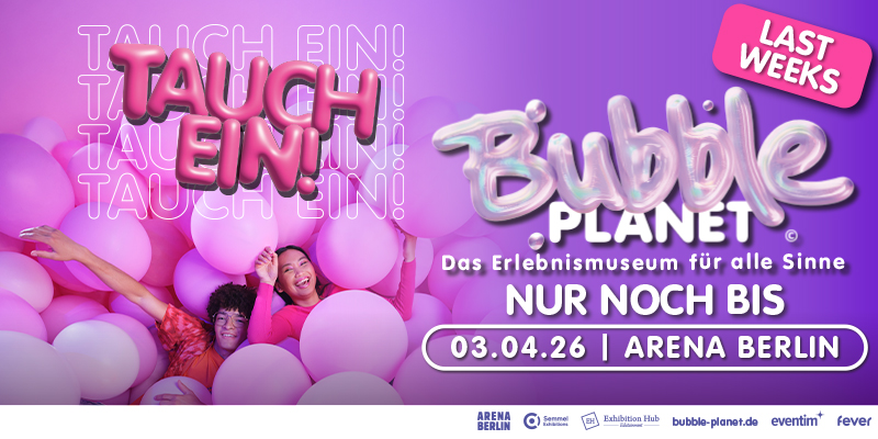 Bubble Planet ist ein immersives Erlebnis, bei dem du von aufregenden Bubbles umgeben bist! Tauche mit VR-Technologie, Themenräumen, fantastischen Landschaften und sogar einem Heißluftballon-Flugsimulator in eine Welt ein, die deine Vorstellungskraft übersteigt. Sichere dir jetzt deine Tickets für Bubble Planet: Das Erlebnismuseum für alle Sinne! Am 12. Dezember 2025 kommt Bubble Planet zum ersten Mal nach Deutschland, mit großer Premiere in der Arena Berlin.